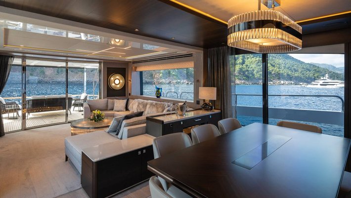 Wonderful boat with many exterior spaces and elegant interior decoration. It has 3 double beds and 1 cabin with 2 beds. There are 4 crew members in separate cabins. It has 2 SeaBobs, stabilizers, swimming platform, paddle surf and a Williams tender for water ski and banana.